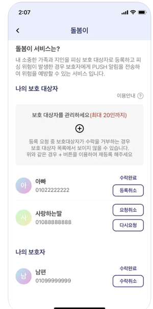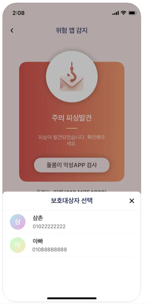 | 의심 전화 탐지 | 보이스피싱 의심 번호 식별 | 경고 시 통화 즉시 종료 |