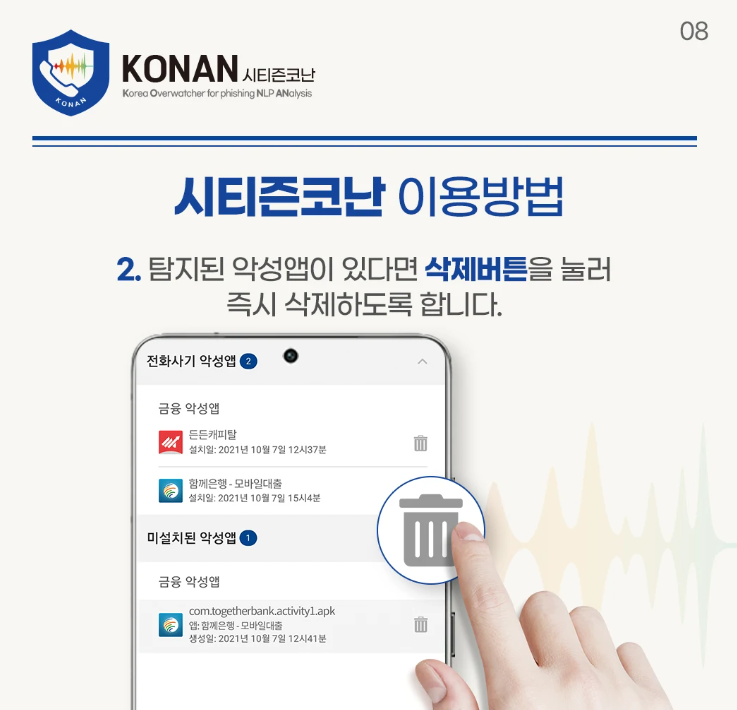 보이스피싱 수법은 계속해서 진화하고 있습니다. 따라서 시티즌 코난 앱도 이에 대응하기 위해 지속적으로 업데이트됩니다. 최소 월 1회 앱 업데이트를 확인하고, 항상 최신 버전을 유지하는 것이 중요합니다.