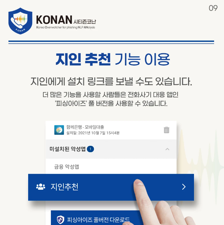 시티즌 코난은 제휴 금융사와 연동하여 보이스피싱 위험이 감지될 경우, 비정상적인 이체나 대출 등의 금융거래를 차단할 수 있습니다. 이 기능은 사용자의 동의를 받은 제휴사에 한해 제공됩니다.
