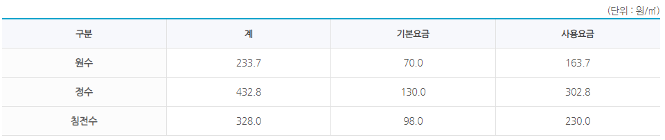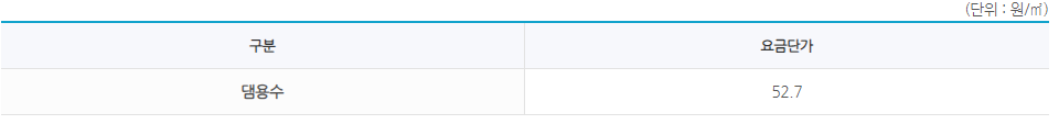댐용수 요금의 경우, 한국수자원공사법 제16조에 따라 환경부장관이 승인한 단가를 기준으로 합니다. 이 역시 전국적으로 동일한 요금이 적용되며, 2016년 9월 23일부터 적용된 댐용수 요금은 1㎥당 52.7원입니다.