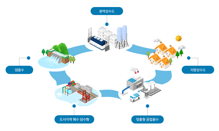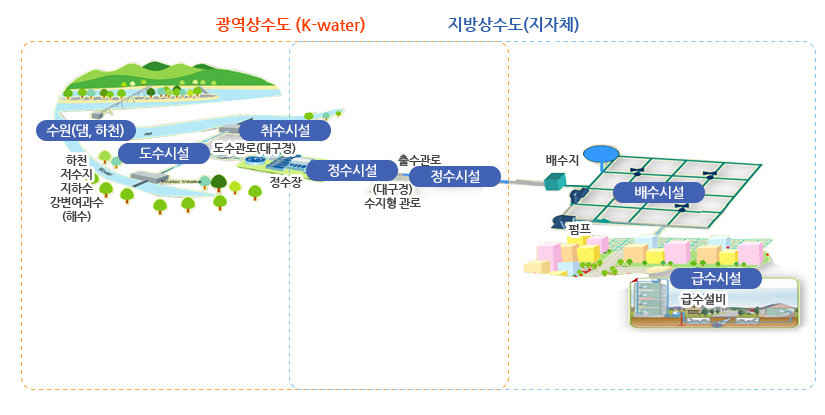 첫째, 광역상수도 요금이 있습니다. 이는 K-water가 관리하는 댐에서 취수한 물을 처리해 지방자치단체나 기업체에 공급하는 수도에 대한 요금이에요. 둘째, 댐용수 요금이 있습니다. K-water가 관리하는 댐이나 하굿둑에서 공급하는 물에 대한 요금이죠. 마지막으로, 우리가 가장 친숙한 지방상수도 요금이 있습니다. 이는 각 지방자치단체가 관할 지역 주민들에게 공급하는 수돗물에 대한 요금입니다.