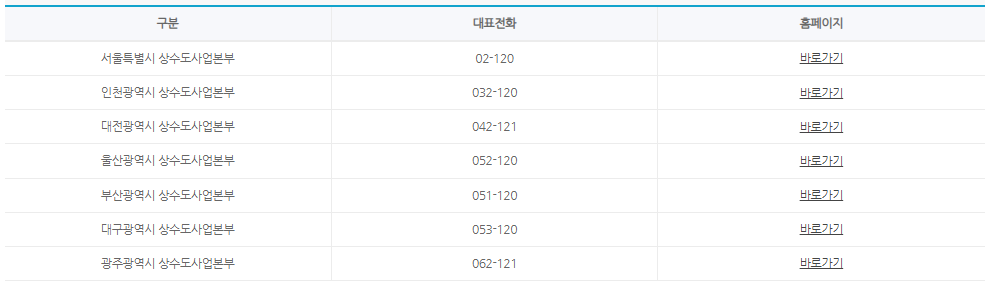 두 번째는 그 외 지역의 경우입니다. 위에 언급된 지역 외에 거주하시는 분들은 해당 지자체의 상수도사업본부나 상수도사업소에 문의하시면 됩니다. 특별시나 광역시에 사시는 분들은 각 도시의 상수도사업본부에 연락하시면 됩니다. 예를 들어, 서울특별시는 02-120, 대전광역시는 042-121 등의 번호로 문의가 가능해요.